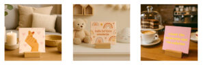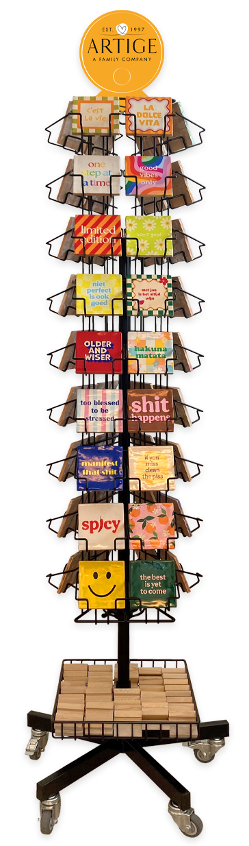 Een uniek decoratief item dat impact maakt in iedere ruimte. Van kleurrijke ontwerpen tot speelse teksten en afbeeldingen, deze 78 unieke, keramische tegels zijn met zorg ontworpen door ons eigen designteam in Doetinchem. De tegels worden geproduceerd in Europa en kunnen gecombineerd worden met een houten presenteerblokje voor een finishing touch.