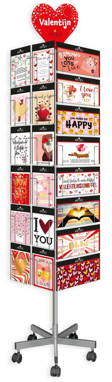 Met onze combi-molen biedt u uw klanten het hele jaar door een steeds wisselende selectie wenskaarten, perfect afgestemd op elk seizoen en iedere gelegenheid. Met de collecties Kerst, Valentijn, Pasen, Communie, Moederdag, Vaderdag, Geslaagd, Bedankt Juf/Meester, Carnaval en (indien gewenst) Kamp en Special, blijft deze molen uw klanten inspireren met een actuele inhoud.